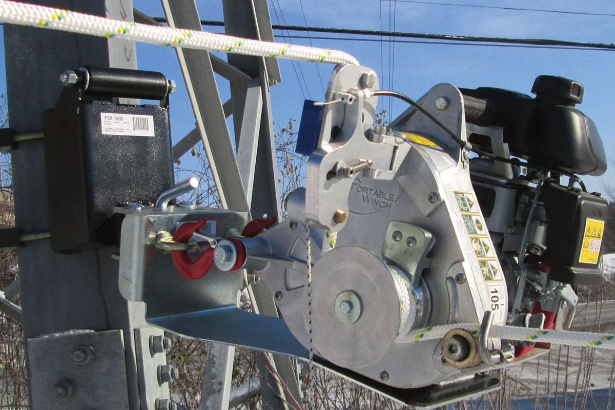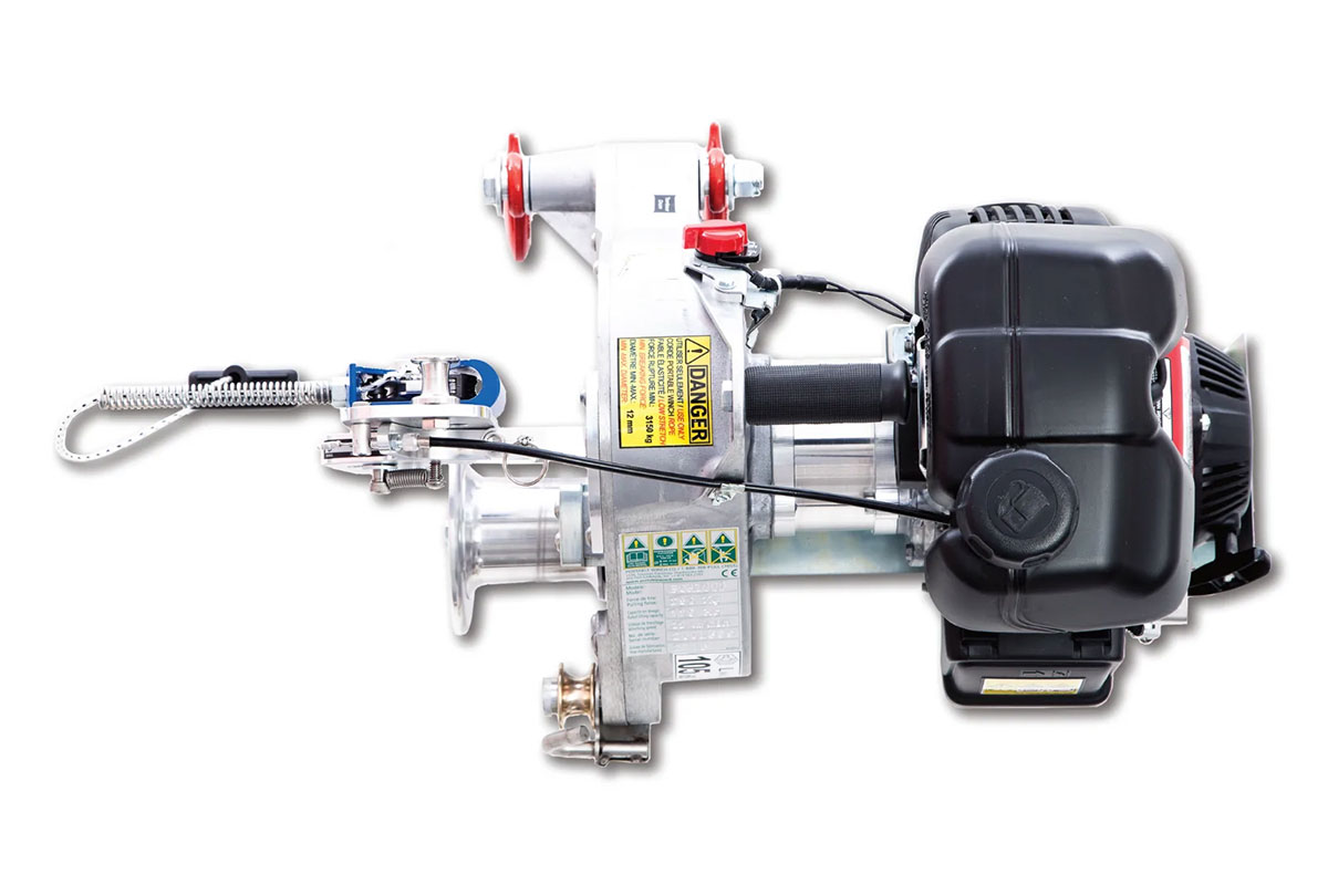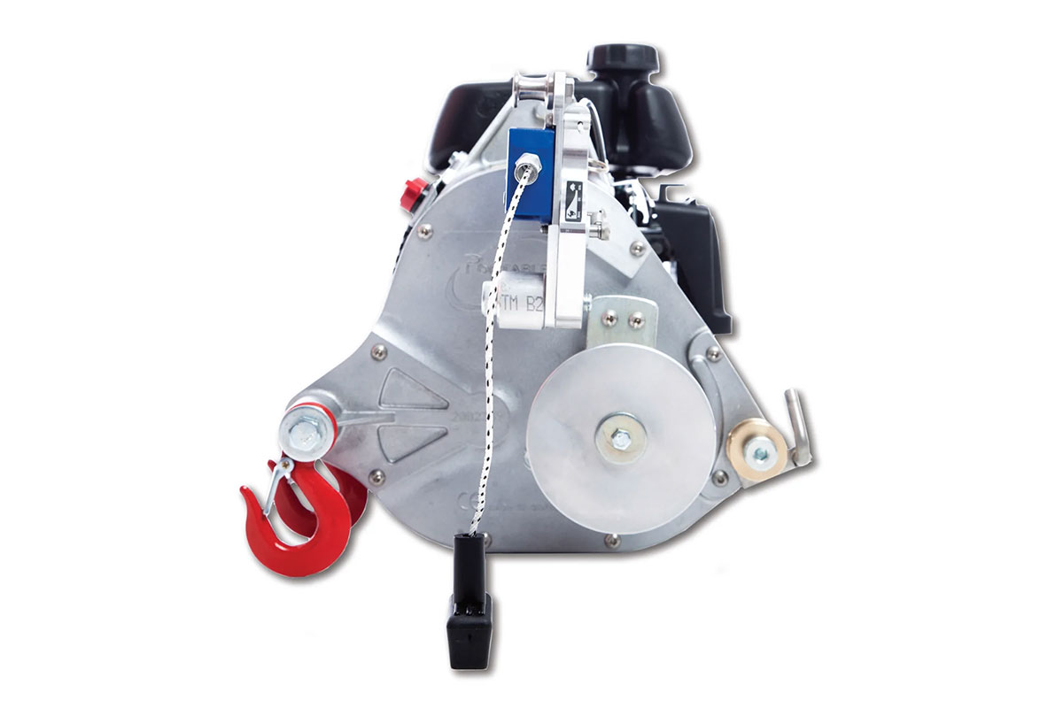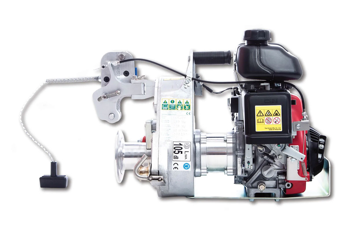 電力関連・送電事業者様へ吊り上げ専用ウィンチの決定版。アクセル連動型自動ブレーキ(尻手取り装置)システム採用のPCW5000SRh。製品重量は19kgと軽量。巻取りスピードは18m/毎分、吊上げ能力は200kgです。吊り上げ能力重視の現場はドラムを変えることで300kg以上の牽引力を発揮します。(吊り上げ速度は12m/毎分)